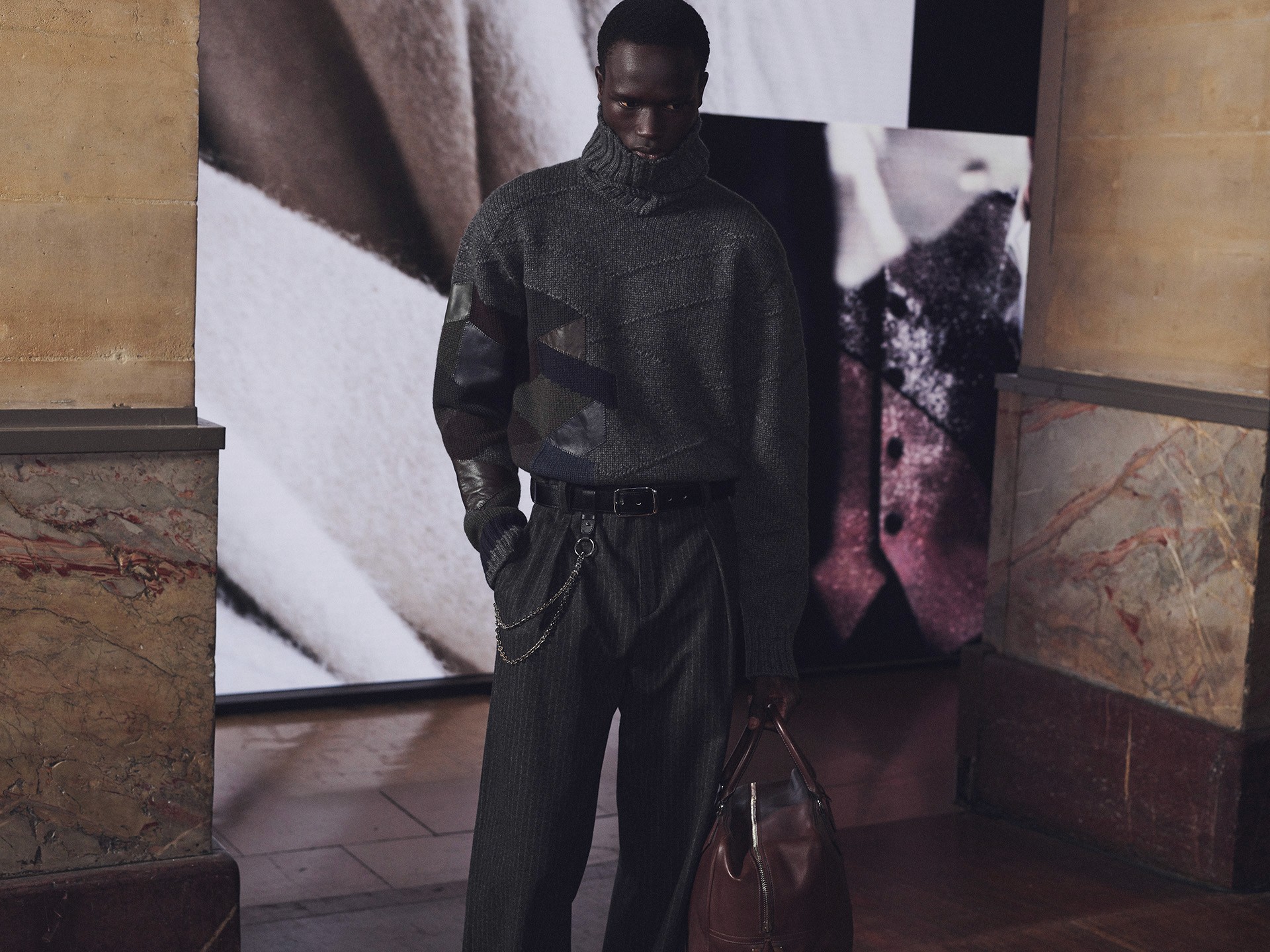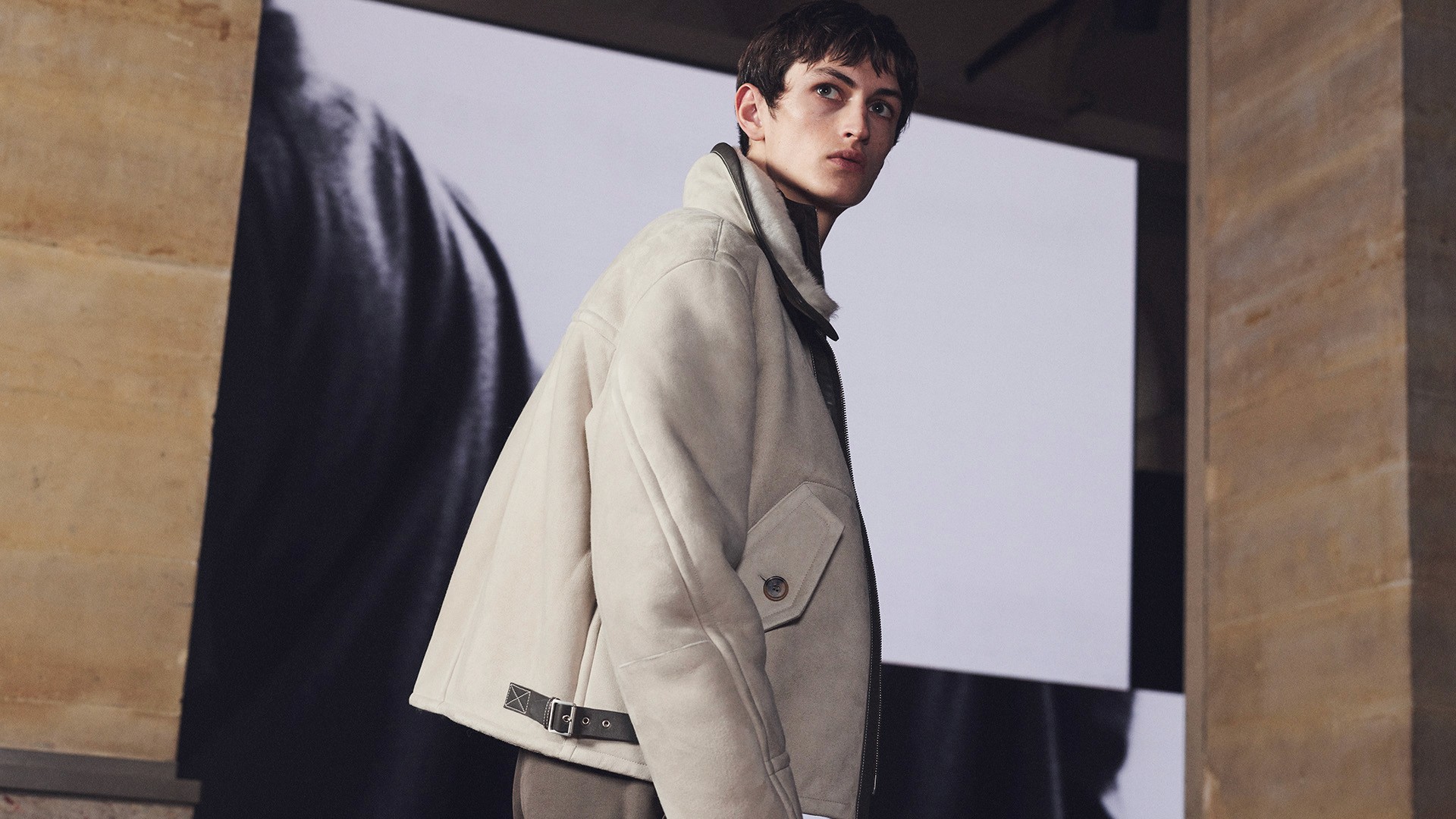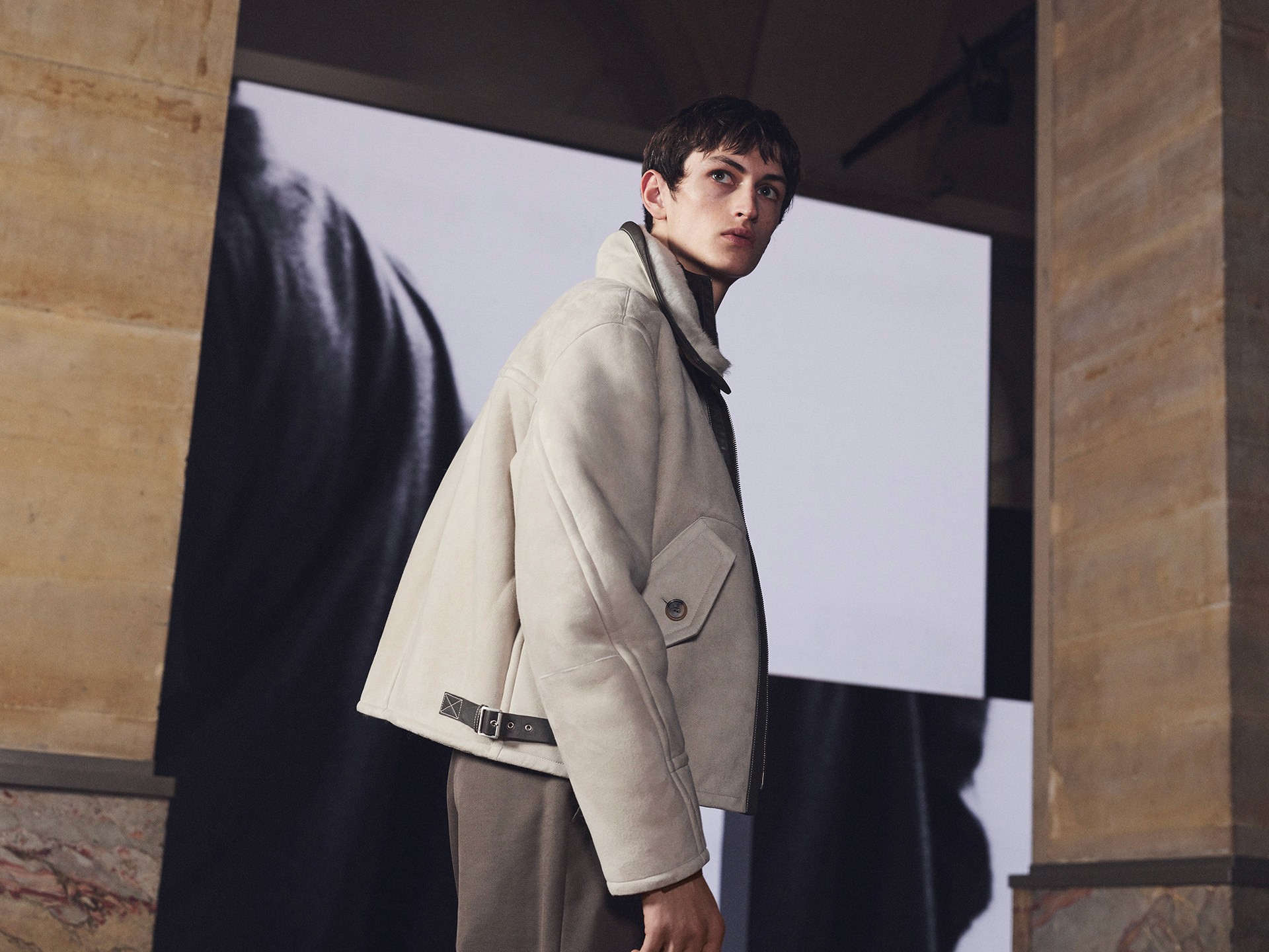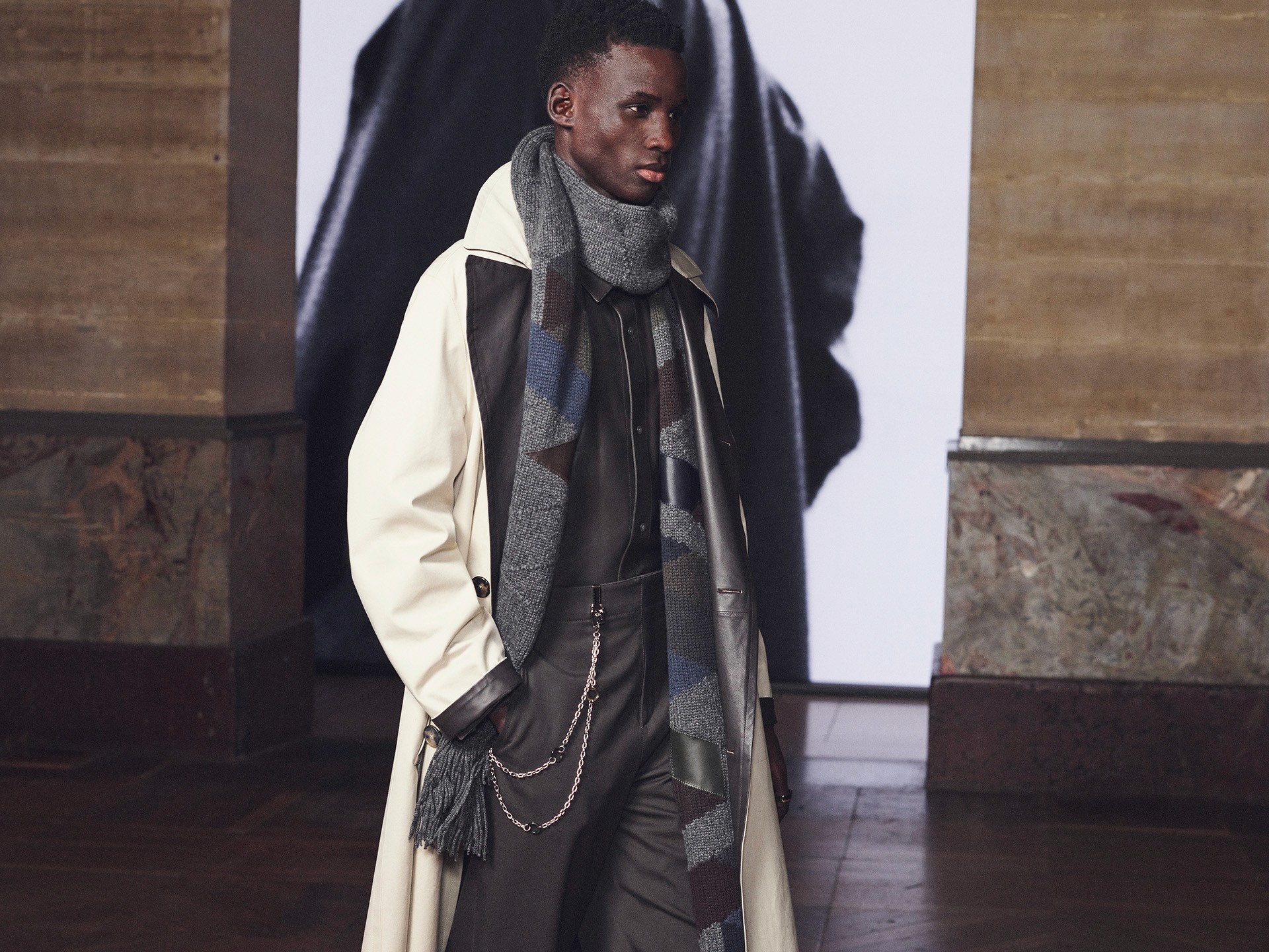 Die Kollektion zeigt Kleidung als Lebensbegleiter. Mäntel aus Lammfell, Anzüge mit Tennisstreifen in Leder, reversible Cashmere-Coats – sie alle wirken vertraut und doch neu, wandelbar und doch konstant. Der Geist dieser Mode liegt im Detail: versteckte Prints, doppelte Verschlüsse, Kontraste zwischen rau und weich.