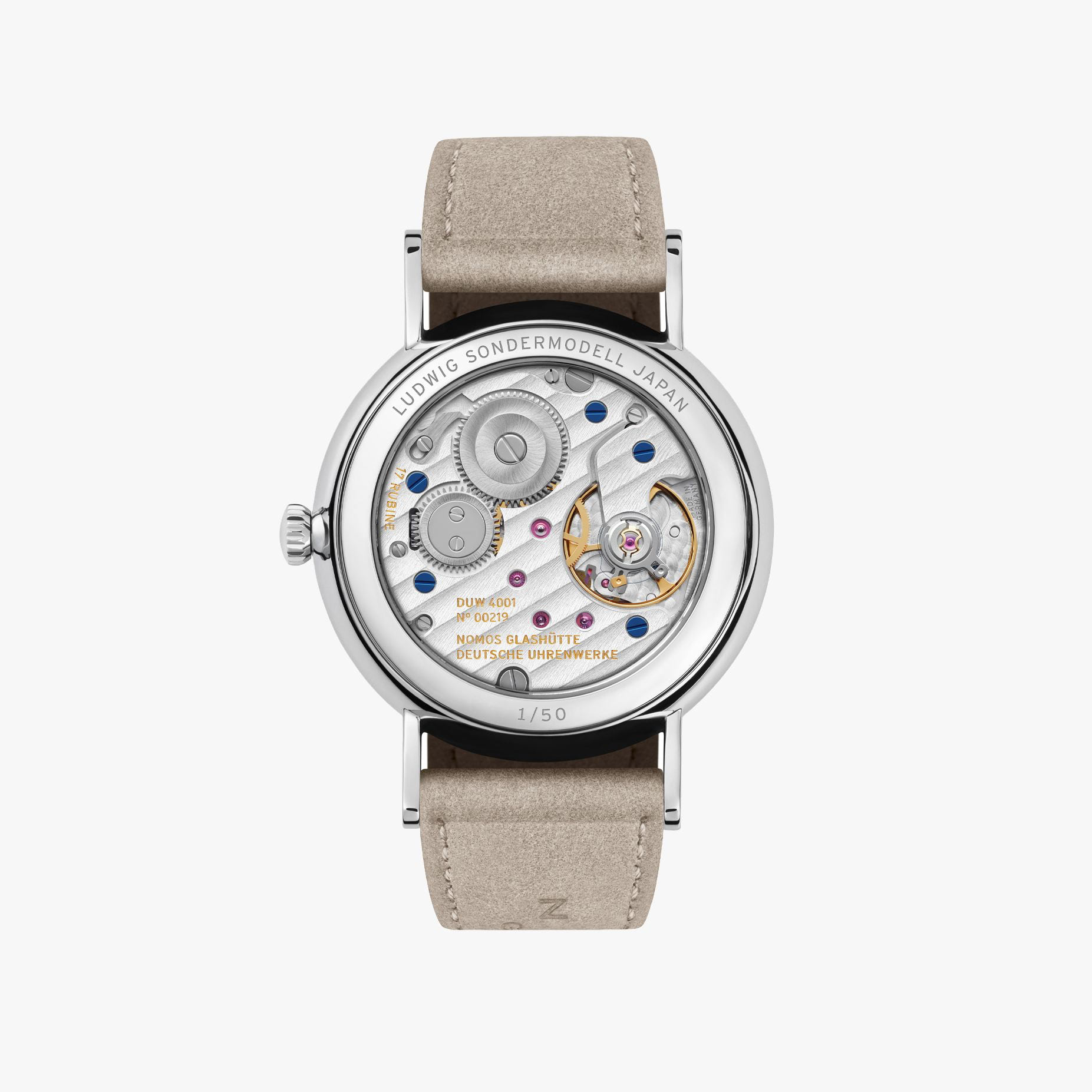 Im Inneren arbeitet das handaufgezogene Manufakturkaliber DUW 4001 Duo. Durch den Saphirglasboden zeigt sich die hochwertige Verarbeitung – ergänzt durch eine exklusive Gravur, die die Limitierung auf nur 50 Exemplare markiert.